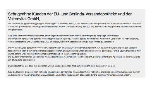 Die EU-Versandapotheke hat sich abgemeldet, aber viele Ex-Kunden und Geschäftspartner mit offenen Rechnungen hinterlassen. Und weil die ehemalige Inhaberin Dr. Bettina Habicht nicht Insolvenz angemeldet hat, laufen immer wieder Forderungen bei ihr ein. Das Außergewöhnliche: Ex-Mitarbeiter helfen den geprellten Kunden, an ihr Geld zu kommen. Und mit dem Online-Bezahldienst Paypal hat die Apothekerin ein weiteres Schwergewicht auf der Gegenseite.