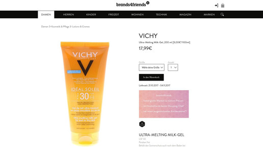 Von Vichy ist die ganze Bandbreite an Produkten bei Brands4Friends gelistet, von Bartpflege über Sonnenschutz bis hin zu Make-up-Entferner. Auch die Kosmetiklinie Lierac vom französischen Kosmetikunternehmen Alès ist mit 71 Produkten vertreten, unter anderem mit Anti-Aging-Produkten und Parfüm. Das Liftingserum Liftissime gibt es zum Beispiel für knapp 60 Euro. In Versandapotheken geht das Produkt für 38 bis 74 Euro weg.