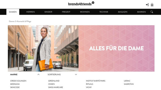 Brands4Friends bietet als Shoppingclub angemeldeten Mitgliedern täglich Rabattaktionen auf bestimmte Markenartikel. Der Schwerpunkt liegt auf Kleidung, aber auch Wohn-, Freizeit-, Technik- und Kosmetikprodukte sind vertreten. Im Bereich Kosmetik gibt es neben Vichy und Lierac auch Produkte von Medisana, Rituals und Sagrotan.