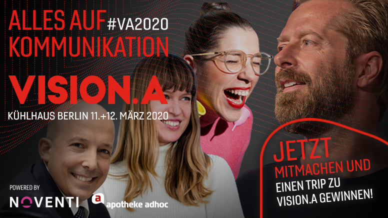 Bei VISION.A 2020, erstmals präsentiert von Exklusivpartner Noventi, treten Sie mit Brancheninsidern, Marketingleads und Digitalexperten in den Dialog und widmen sich der Frage nach der Apotheke von morgen. Bei der Digitalkonferenz des Jahres erwarten Sie am 11. und 12. März im Kühlhaus Berlin rund 500 Gäste, mehr als 50 Speaker, eineinhalb Tage Wissen und Networking pur.