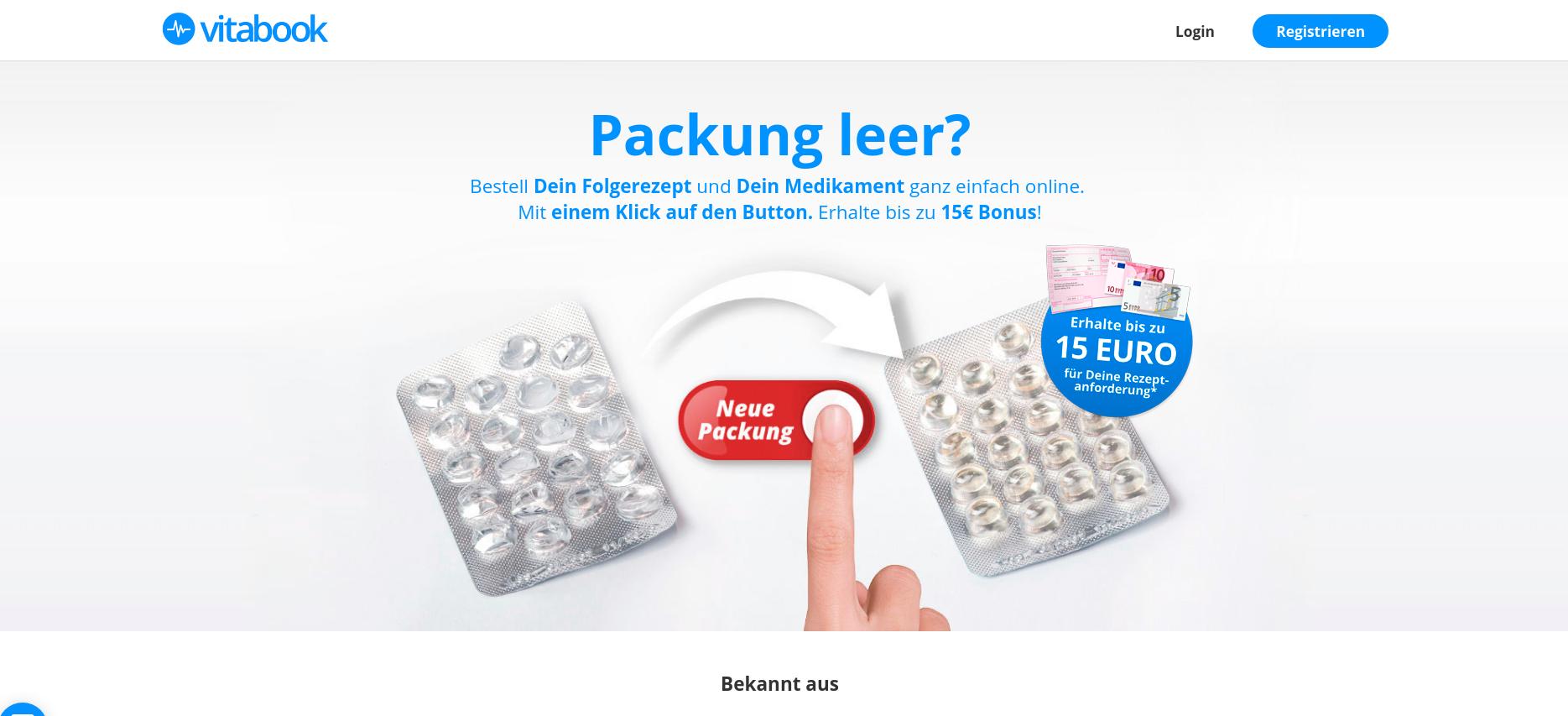 Das E-Health-Portal Vitabook hat ein sogenanntes E-Rezept eingeführt. Dabei handelt es sich aber nicht um ein elektronisches Rezept, sondern um ein Folgerezept aus Papier, das vom Patienten online angefordert wird. Das Unternehmen lockt seine Kunden mit einem Bonus von bis zu 15 Euro.