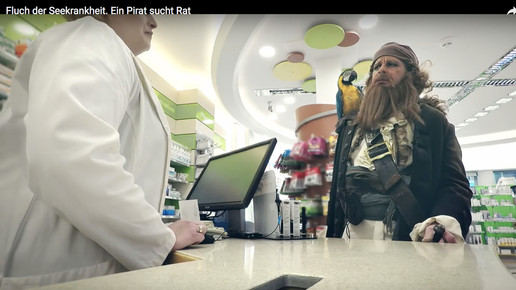 Was sich ein Pirat nicht leisten kann, ist seekrank zu sein. „Berufsunfähigkeit“ wäre die Folge. In einem Youtube-Spot zeigt der Vomex-Hersteller Klinge, wie ein liebenswerter Seeräuber in der Apotheke Hilfe findet.