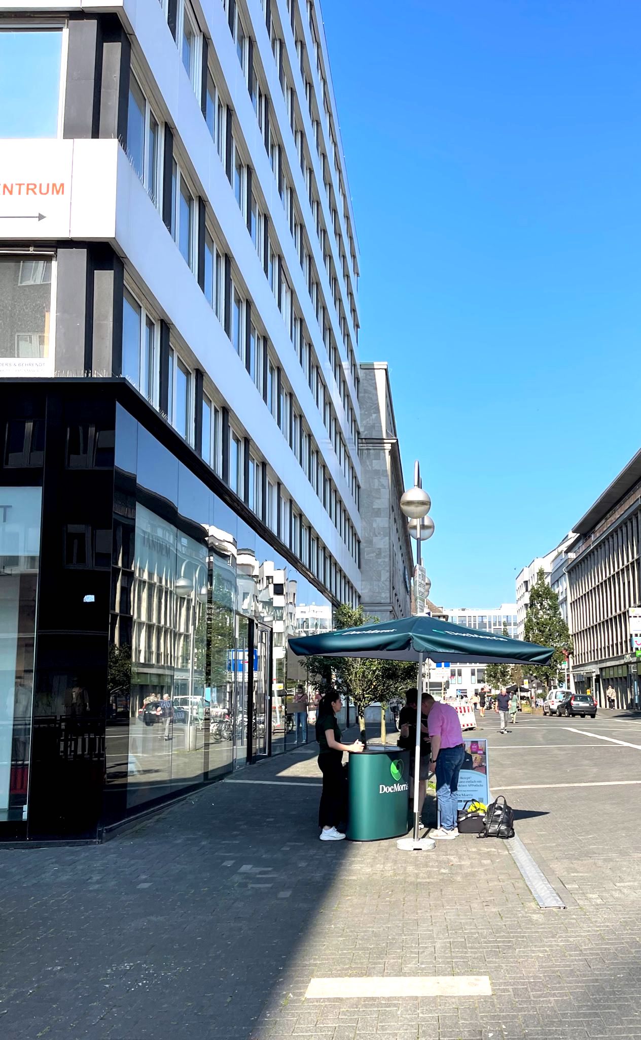 Ganz analog zeigt sich DocMorris derzeit in Bochum: Mit einem grünen Tisch, der den DocMorris-Schriftzug zeigt und grünem Sonnenschirm will der niederländische Versender Passanten anziehen. An einem Infostand können sich Interessierte über die Services informieren.