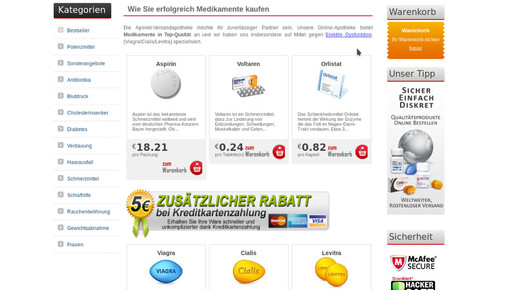 Um Seriösität zu heucheln, werden zur Tarnung erst Aspirin und Voltaren angeboten, dann kommen die Potenzmittel Viagra, Cialis, Levitra, alles in „soft” oder „super active”. Dazwischen wieder ein wenig Xenical zum Abnehmen oder Diclofenac, dann geht es mit den Potenzpillen weiter, für Männer und Frauen. Die Tablettenpreise werden pro Stück in Euro oder Centbeträgen angegeben, was offenbar den Eindruck erwecken soll, dass es sich jeder leisten kann.
