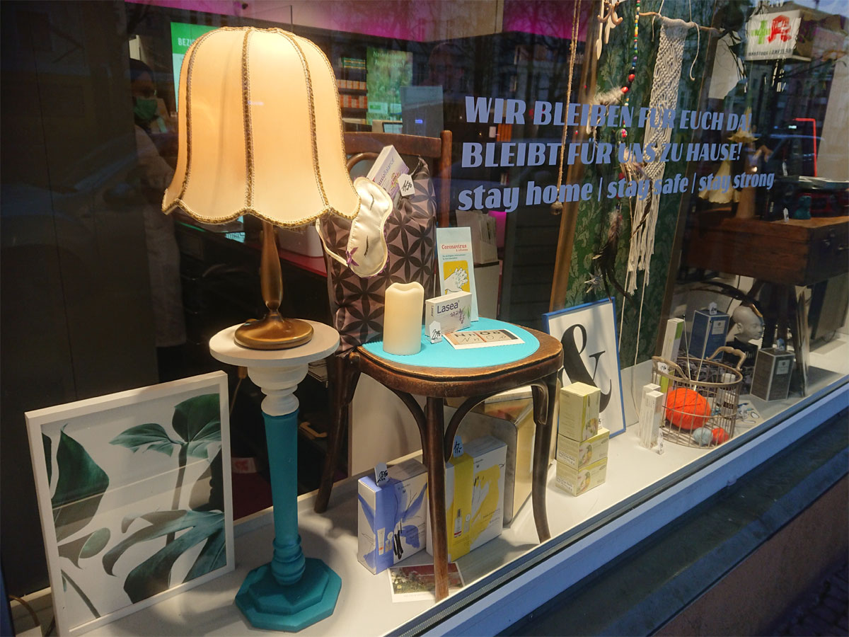 Auch zu Beginn des bundesweiten Lockdowns und darüber hinaus hat sie „ihre“ Apotheken betreut und ganz unterschiedliche Schaufenster gestaltet: Eine Apotheke wurde mit handbemalten Buddha-Figuren, Bambus und weisen Aussagen ausgestattet, um die Betrachter in dieser stressigen Zeit zu beruhigen und die verordnete Auszeit zu Hause zu betonen. In einer anderen wurde auf den Mangel an Mund-Nasen-Bedeckungen und das persönliche Engagement der Apotheke, welche selbst Community-Masken produzierte, aufmerksam gemacht. Belgert weiß: „Es ist ungemein wichtig, sich in das jeweilige Thema einzuarbeiten. Dann kommen auch die Ideen für gute Gestaltung.“