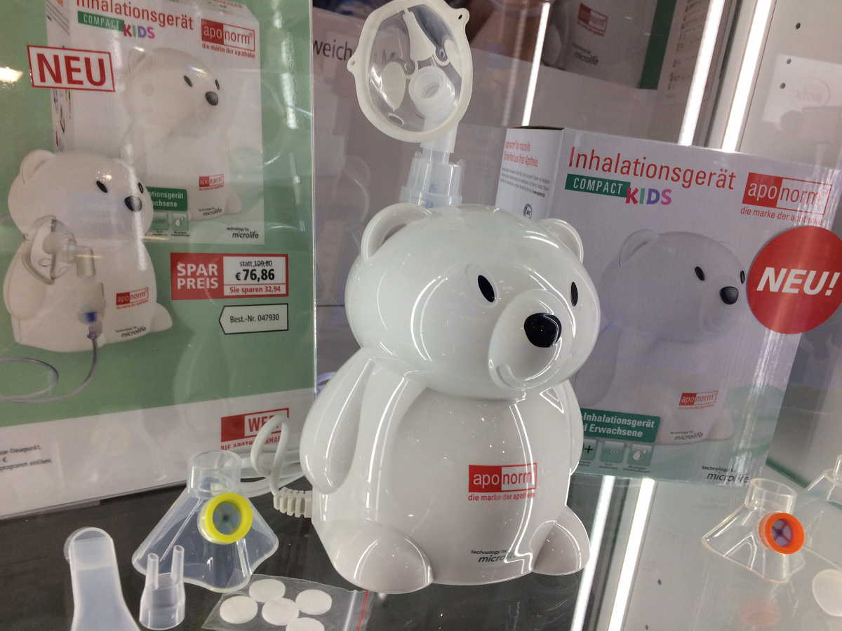 Der Bärcheninhalator von Wepa soll den kleinen Patienten die Inhalation spielerisch erleichtern. Das Design des freundlichen Eisbären soll den Kindern die Angst vor der Inhalation nehmen. Vernebelt wird in einer Teilchengröße von 3,1 µm Mass Median Aerodynamic Diameter (MMAD). Dem Hilfsmittel – für das der Antrag einer Hilfsmittelpositionsnummer noch läuft – liegen zwei Masken sowohl für Babys als auch Kleinkinder bei. Gerät und Zubehör sind frei von Phthalaten und Bisphenol A.