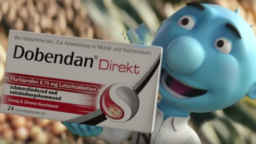 Wick wirbt aktuell mit „vier bunten Lampen“ für den Erkältungssirup Wick MediNait. Damit sollen der 4-in-1-Effekt gegen Erkältungssymptome, die den Patienten vom Schlaf abhalten, dargestellt werden. Natürlich ist auch der kranke Ehemann dabei, der seine Frau nach seiner Mama fragt. Bei Dobendan Direkt von Reckitt Benckiser sind es rote Monster, die die Halsschmerz-geplagte Frau begleiten und in den Hals piksen. Dann wird das blaue Dobendan-Männchen eingespielt, das die Wirkung der Lutschtabletten mit Flurbiprofen erklärt.