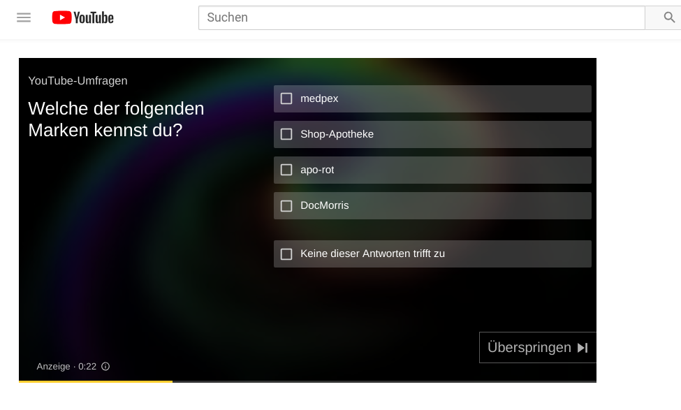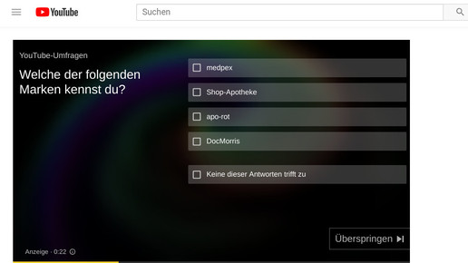 Aktuell befragt Youtube die Nutzer nach Versandapotheken. Auf die Frage: „Welche der folgenden Marken kennst du“ werden fünf Antwortmöglichkeiten genannt. Die Zuschauer können die Versandapotheken Medpex, Shop-Apotheke, Apo-Rot und DocMorris sowie „Keine dieser Antworten trifft zu“ auswählen. Der Einspieler ist als „Youtube-Umfrage“ betitelt.
