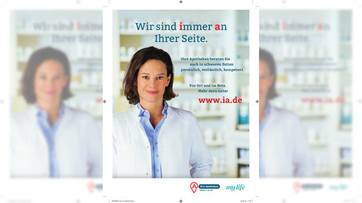 Vom 29. April bis zum 8. Juli lächelt in 29 Burda-Magazinen eine freundliche Apothekenmitarbeiterin die Leser an. „Wir sind immer an ihrer Seite“, heißt es in der Anzeige – das dritte I und das erste A in rot, um die Initialen „IA“ für „Ihre Apotheke“ zu highlighten. „Ihre Apotheke beraten sie auch in schwierigen Zeiten persönlich, verlässlich, kompetent.“ Zu sehen ist das ganzseitige Motiv unter anderem in den Magazinen Focus, Bunte, TV Spielfilm, Freizeit Revue, Freundin, Lisa und Super Illu.