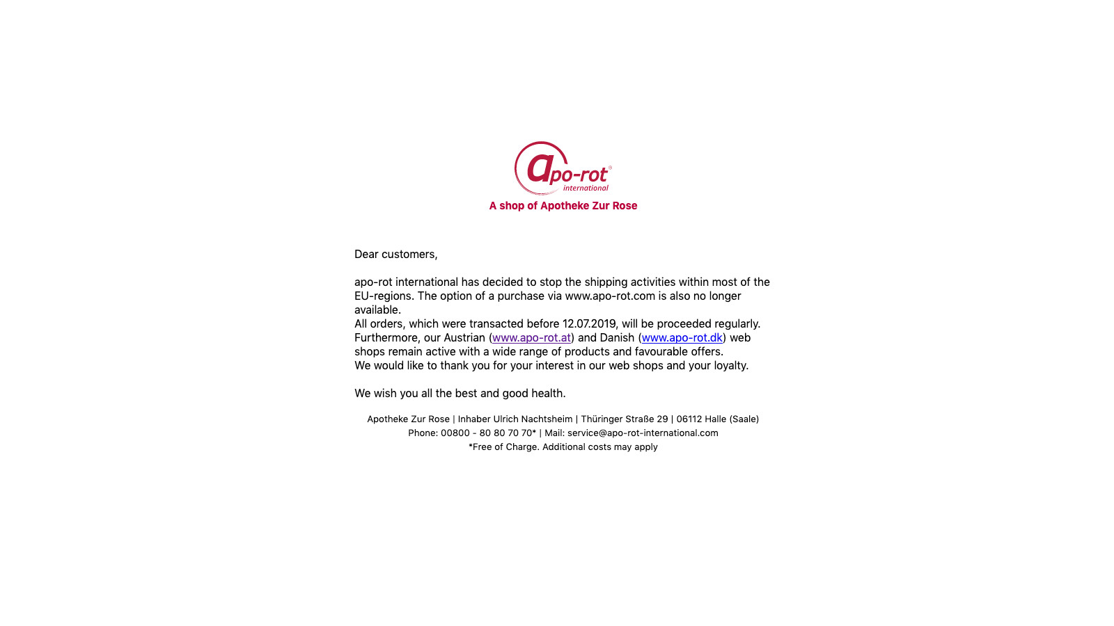 Zur Rose hatte Apo-Rot im Mai 2018 übernommen. Der Versand wurde wenig später nach Heerlen verlegt; das Auslandsgeschäft wiederum wurde in Halle/Saale abgewickelt und vor kurzem weitgehend eingestellt. Die Bereiche Marketing, Service und IT sollten dagegen nach der ursprünglichen Ankündigung in Hamburg bleiben.