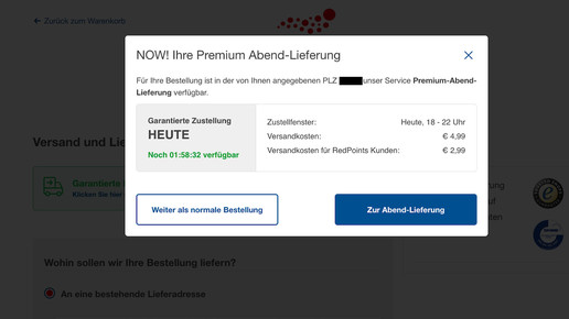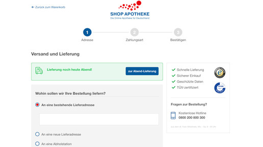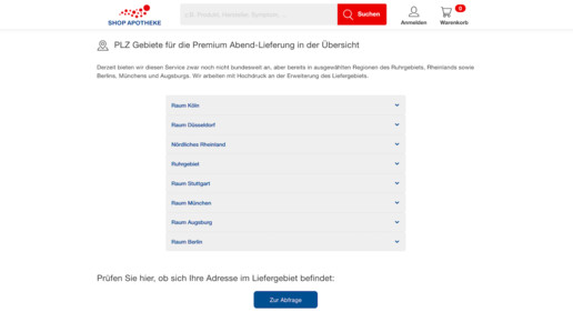 Laut Shop Apotheke ist „aktuell bei der Premium Abend-Lieferung nur eine Zustellung an Privatadressen möglich“. Rezeptpflichtige Bestellungen seien „derzeit leider aus rechtlichen Gründen ausgeschlossen“. Außerdem verspricht der Versender: „Wir arbeiten mit Hochdruck an der Erweiterung des Liefergebiets.“