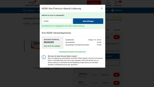 Das Prinzip ist einfach: Kunden im entsprechenden PLZ-Bereich können ab einem Einkaufswert von 15 Euro wählen, ob sie die Ware noch am selben Abend geliefert haben wollen. Die West-Apotheke deckt die Liefergebiete München, Augsburg und Stuttgart ab – hier ist die Same-Day-Zustellung „für kurze Zeit“ sogar kostenlos. In Berlin kommt die Ware von der Spielberger-Apotheke, hier fallen – wie auch bei Shop-Apotheke in NRW – 4,99 Euro an. Kunden des Vorteilsprogramms RedPoints zahlen 2,99 Euro.