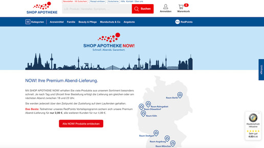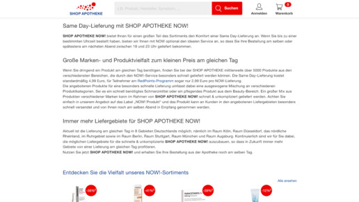 Das Konzept „Shop Apotheke Now!“ gibt es seit knapp zwei Jahren. Kunden in Teilen von Nordrhein-Westfalen – Raum Köln, Raum Ruhrgebiet, Raum Düsseldorf – erhalten ihre Ware noch am selben Abend. Vom Standort in Venlo aus werden die Pakete per Expresskurier gebracht.