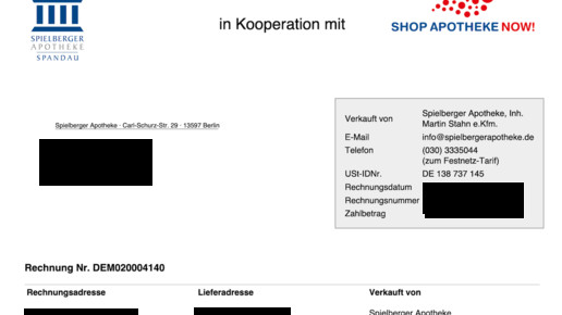 Die Rechnung findet man im Kundenkonto, hier ist als Absender tatsächlich die Apotheke angegeben – „in Kooperation mit Shop Apotheke Now!“, wie es heißt. Hier sind für Fragen zur Rechnung auch die erforderlichen Kontaktdaten der Apotheke zu finden, der Betrag soll allerdings auf das Konto von Shop Apotheke überwiesen werden.