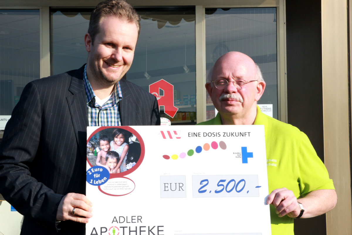 Das Herzstück der Aktion „Eine Dosis Zukunft“ bilden nach wie vor Spendensammlungen in den Apotheken: In 350 westfälisch-lippischen Apotheken sind Informationsflyer und Spendenboxen zu finden – Tendenz steigend. Heinz-Peter Wittmann von der Adler-Apotheke in Rödinghausen übergab im letzten Februar einen Spendenscheck in Höhe von 2.500 Euro. Stolze 1.000 Euro kamen im Herbst durch den Verkauf historischer Apothekengefäße in der Halterner Bären-Apotheke von Dr. Dirk Schulte-Mecklenbeck zusammen. Offizinutensilien mit historischem Wert verkauft derzeit auch Annette Fuchs in ihrer Fuchs-Apotheke im münsterländischen Lengerich.
