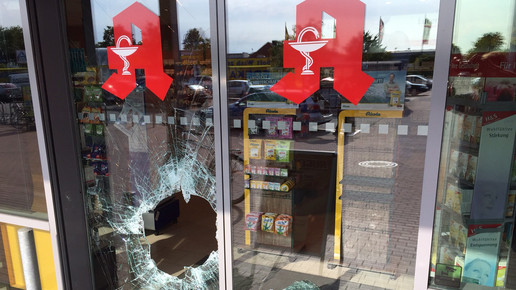 Die Polizei Dinslaken sucht nach einem Mann, der in der Nacht zum Samstag die Scheibe einer Apotheke an der Friedrich-Ebert-Straße einschlug. Durch das zerstörte Fenster gelangte der Unbekannte in die Offizin und machte sich mit dem erbeuteten Bargeld davon. Der Sachschaden sowie der gestohlene Bargeldbetrag wurden noch nicht näher beziffert.