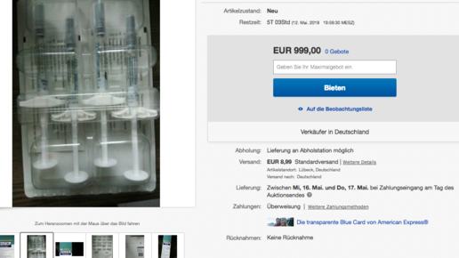 Ebenfalls bei Ebay – jedoch als Auktion – ist derzeit das Rheumamittel Enbrel. „Madplayer“ bietet vier Fertigpens an den Höchstbietenden an. Startpreis ist 999 Euro. Artikelstandort ist Lübeck. Das Produkt soll neu und unbenutzt sein; Listenpreis sind eigentlich 1700 Euro. Die Ware kommt aus Slowenien. Der Verkäufer hat durchweg positive Bewertungen und verkauft auch Parfums, Handys oder einen Fleischwolf.