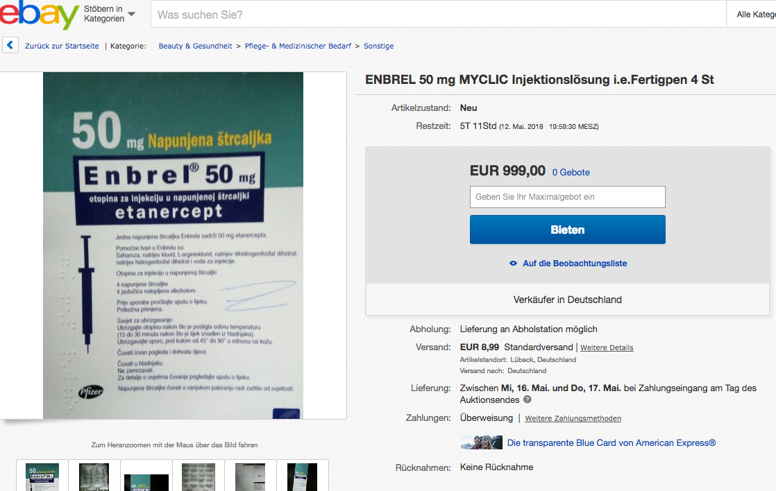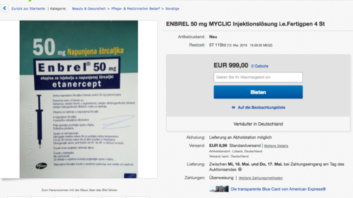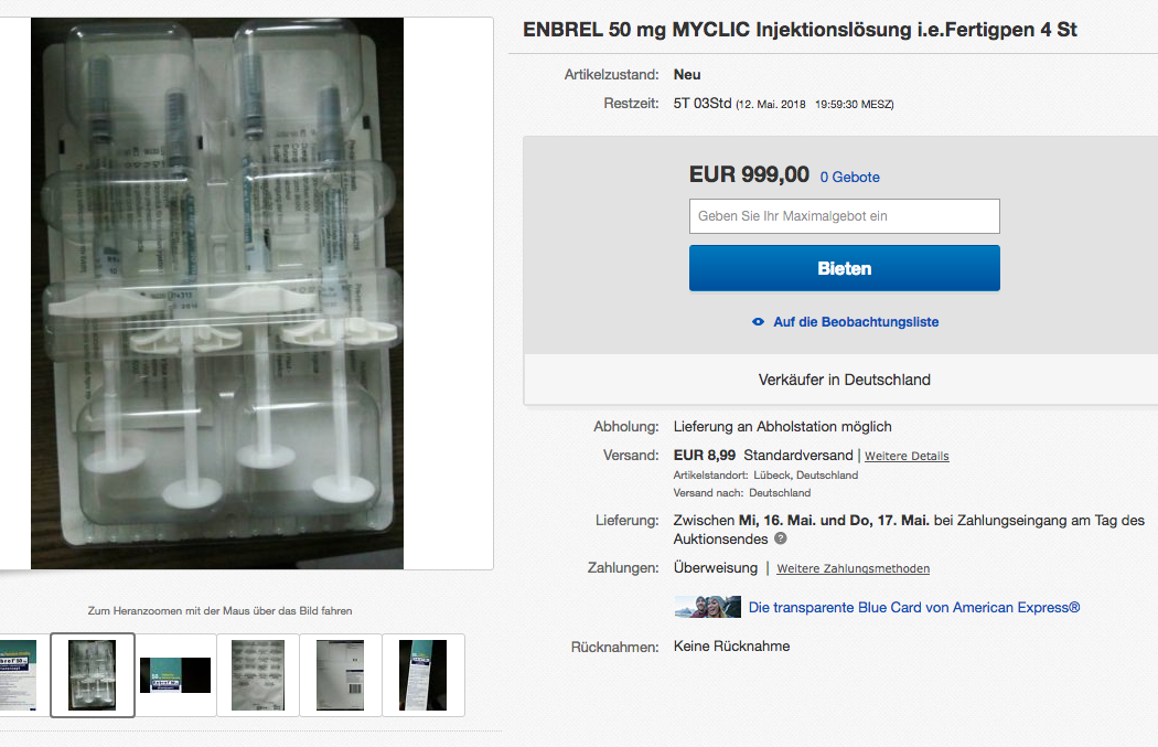 Ebenfalls bei Ebay – jedoch als Auktion – ist derzeit das Rheumamittel Enbrel. „Madplayer“ bietet vier Fertigpens an den Höchstbietenden an. Startpreis ist 999 Euro. Artikelstandort ist Lübeck. Das Produkt soll neu und unbenutzt sein; Listenpreis sind eigentlich 1700 Euro. Die Ware kommt aus Slowenien. Der Verkäufer hat durchweg positive Bewertungen und verkauft auch Parfums, Handys oder einen Fleischwolf.