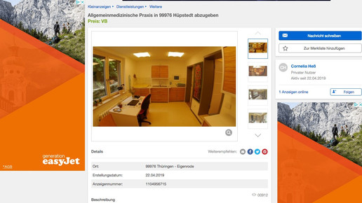 Verschiedene Anzeigen habe sie schon geschaltet, unter anderem im Ärzteblatt Thüringen. Meldet sich bis zum 30. Juni niemand, der die Praxis übernimmt, schließt sie die kassenärztliche Vereinigung endgültig. Die Anzeige bei eBay sei deshalb ihre letzte Hoffnung. „Moderne Praxisausstattung und motivierte Mitarbeiterinnen sind vorhanden, das übliche Leistungsspektrum LUFU, Langzeitblutdruck, EKG, Impfen, Psychosomatik, Palliativmedizin wurden erbracht“, bewirbt sie ihre Praxis in der Annonce. Der Umsatz sei überdurchschnittlich, rund 1400 Patienten kämen pro Quartal. Unterstützung, Einarbeitung und Dienstübernahme seien ebenfalls möglich.