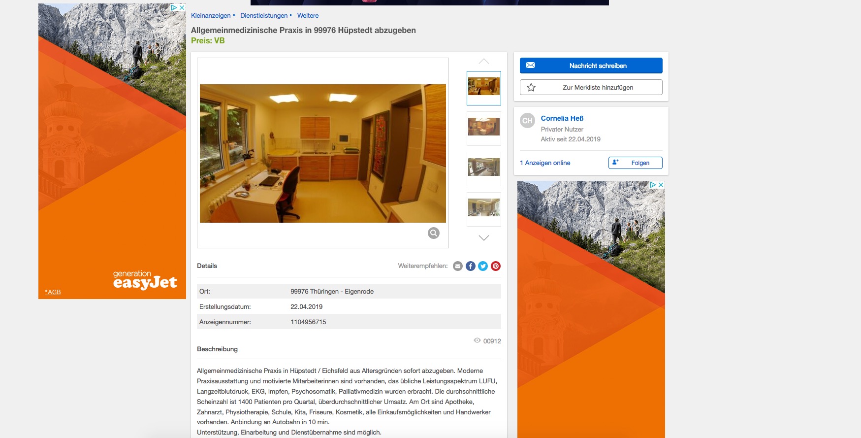 Kindersitz Römer, Kipplaster für Kinder, allgemeinmedizinische Praxis: Das sind die ersten drei Ergebnisse, wenn man bei eBay Kleinanzeigen nach dem thüringischen Ort Hüpstedt sucht. Ärztin Cornelia Heß will aufhören, findet aber keinen Nachfolger. Also versucht sie es über das Online-Auktionsportal.