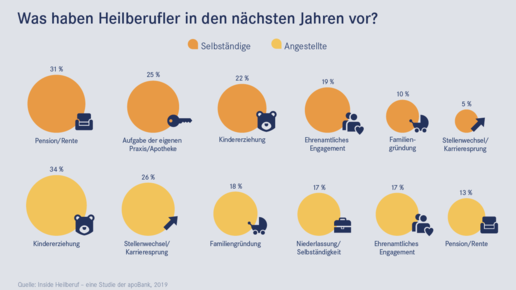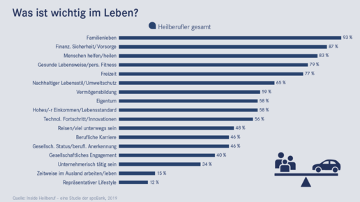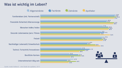 Insgesamt sind beiden Geschlechtern zwar ideelle Werte wichtiger als materielle, doch Frauen legen weniger Wert auf hohen Lebensstandard, Eigentum und Vermögensbildung als Männer. Die berufliche Karriere ist den Ärztinnen, Zahnärztinnen und Apothekerinnen fast genauso wichtig wie ihren männlichen Kollegen, jedoch sehen sie sich nicht so sehr als Unternehmerinnen (24 vs. 42 Prozent).