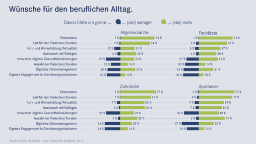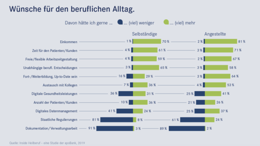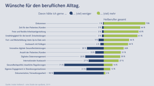 Nach den Wünschen für den beruflichen Alltag gefragt, fällt auf, dass beim Thema Einkommen trotzdem 80 Prozent Frauen einen Aufholbedarf sehen – bei ihren männlichen Kollegen sind es 72 Prozent. Mehr Zeit für die Patienten, flexiblere Arbeitszeitgestaltung und mehr Unabhängigkeit bei beruflichen Entscheidungen stehen bei beiden Geschlechtern oben auf der Wunschliste.