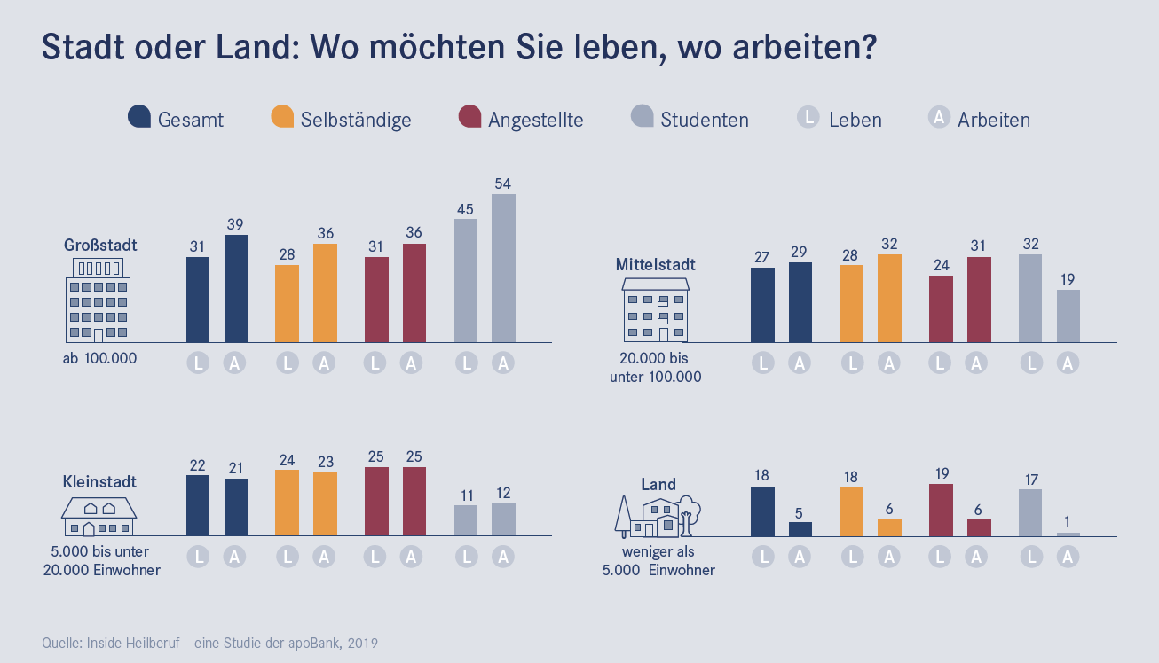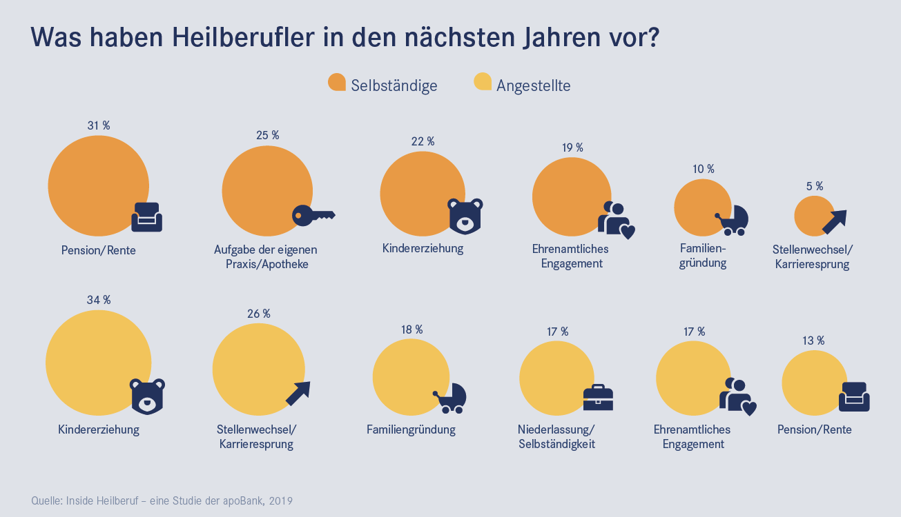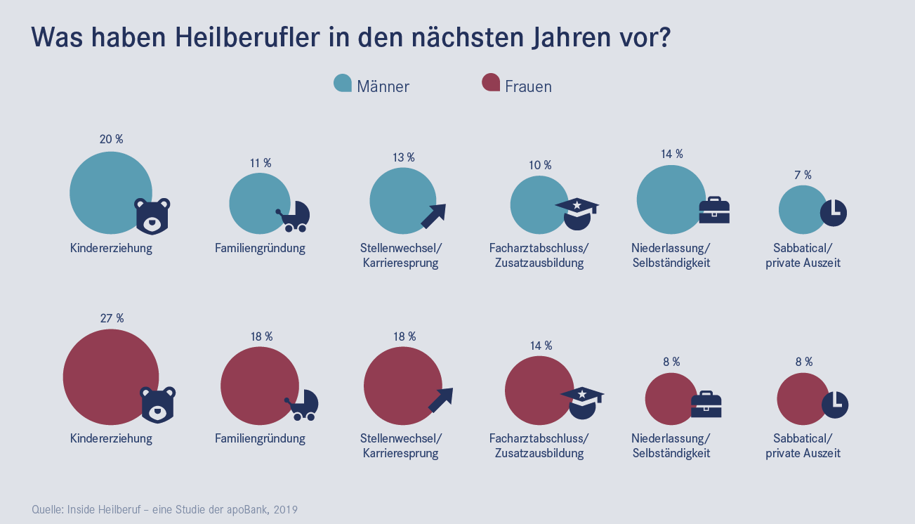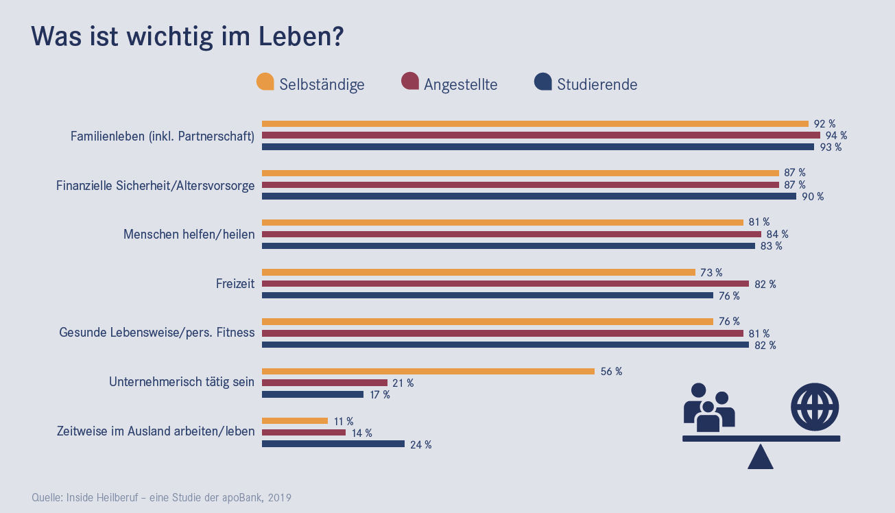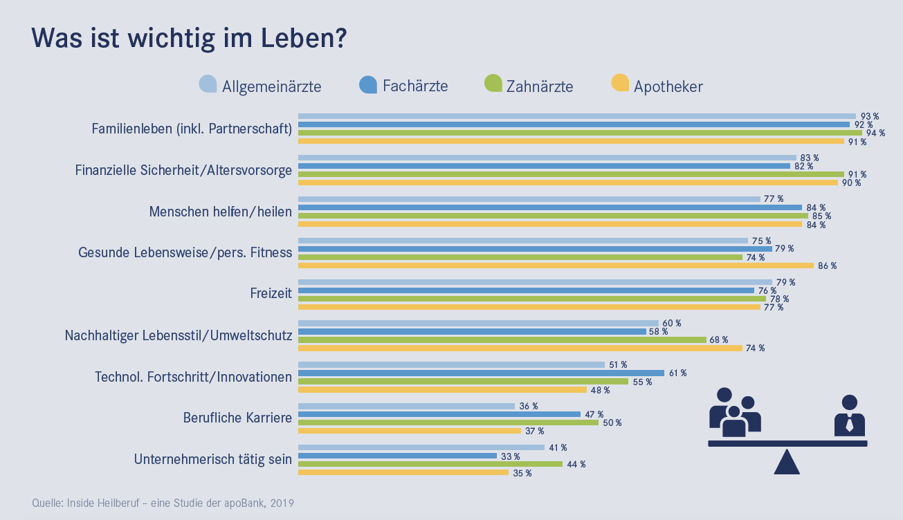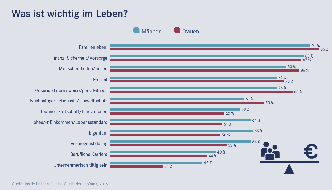 Insgesamt sind beiden Geschlechtern zwar ideelle Werte wichtiger als materielle, doch Frauen legen weniger Wert auf hohen Lebensstandard, Eigentum und Vermögensbildung als Männer. Die berufliche Karriere ist den Ärztinnen, Zahnärztinnen und Apothekerinnen fast genauso wichtig wie ihren männlichen Kollegen, jedoch sehen sie sich nicht so sehr als Unternehmerinnen (24 vs. 42 Prozent).