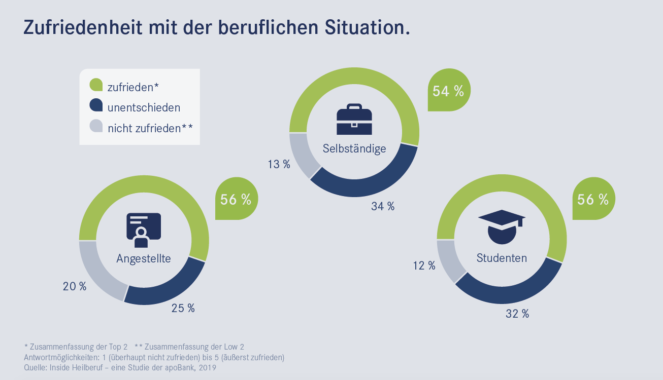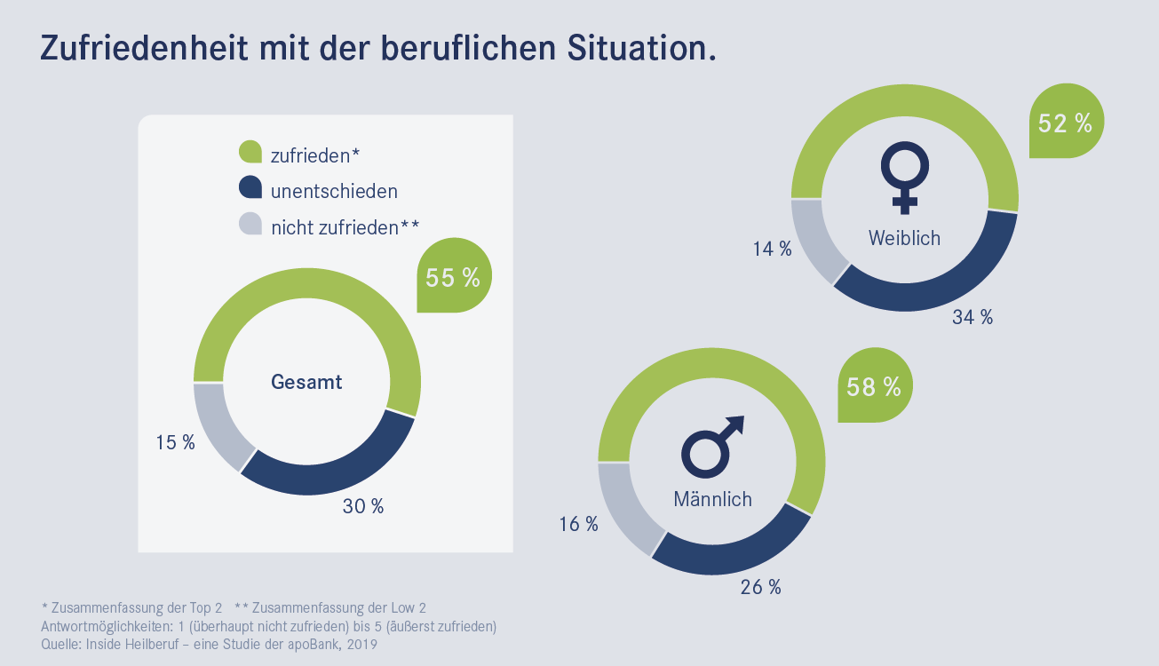 „Die sinkende Zufriedenheit unter den Heilberuflerinnen ist ein Warnsignal, denn sie werden mehrheitlich die Gesundheitsversorgung von morgen gestalten“, sagt Daniel Zehnich, Leiter des Bereichs Gesundheitsmärkte und Gesundheitspolitik bei der Apobank. „Deshalb ist es besonders wichtig, dass wir uns genauer anschauen, wie Frauen in den Heilberufen leben und arbeiten wollen. Laut unserer Studie ist vor allem ein Arbeitsumfeld wichtig, das Familie und Privatleben als oberste Priorität respektiert, indem es eine flexible und freie Arbeitszeitgestaltung zulässt. Dabei steht die Patientenbehandlung im Vordergrund, mit möglichst wenig Bürokratie und überschaubarer unternehmerischer Tätigkeit in der eigenen Praxis. Zudem sind genügend Zeit für Fortbildung und Austausch mit Kollegen gewünscht.“