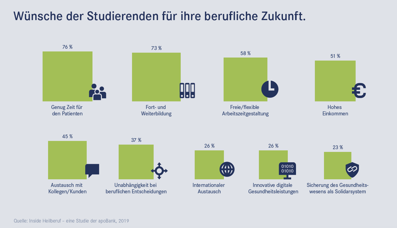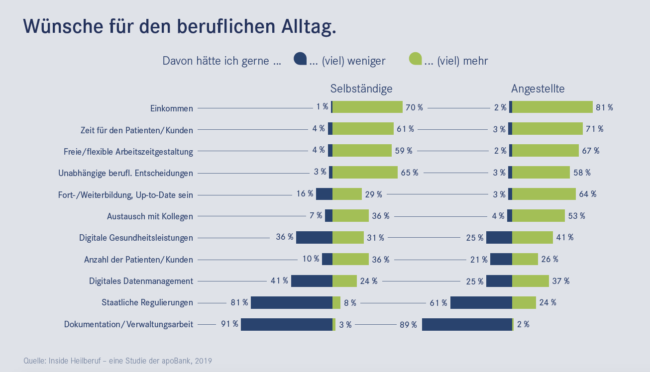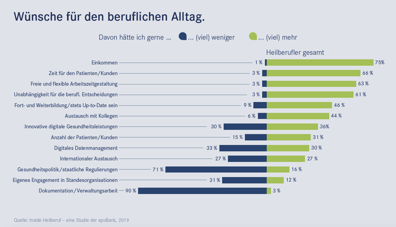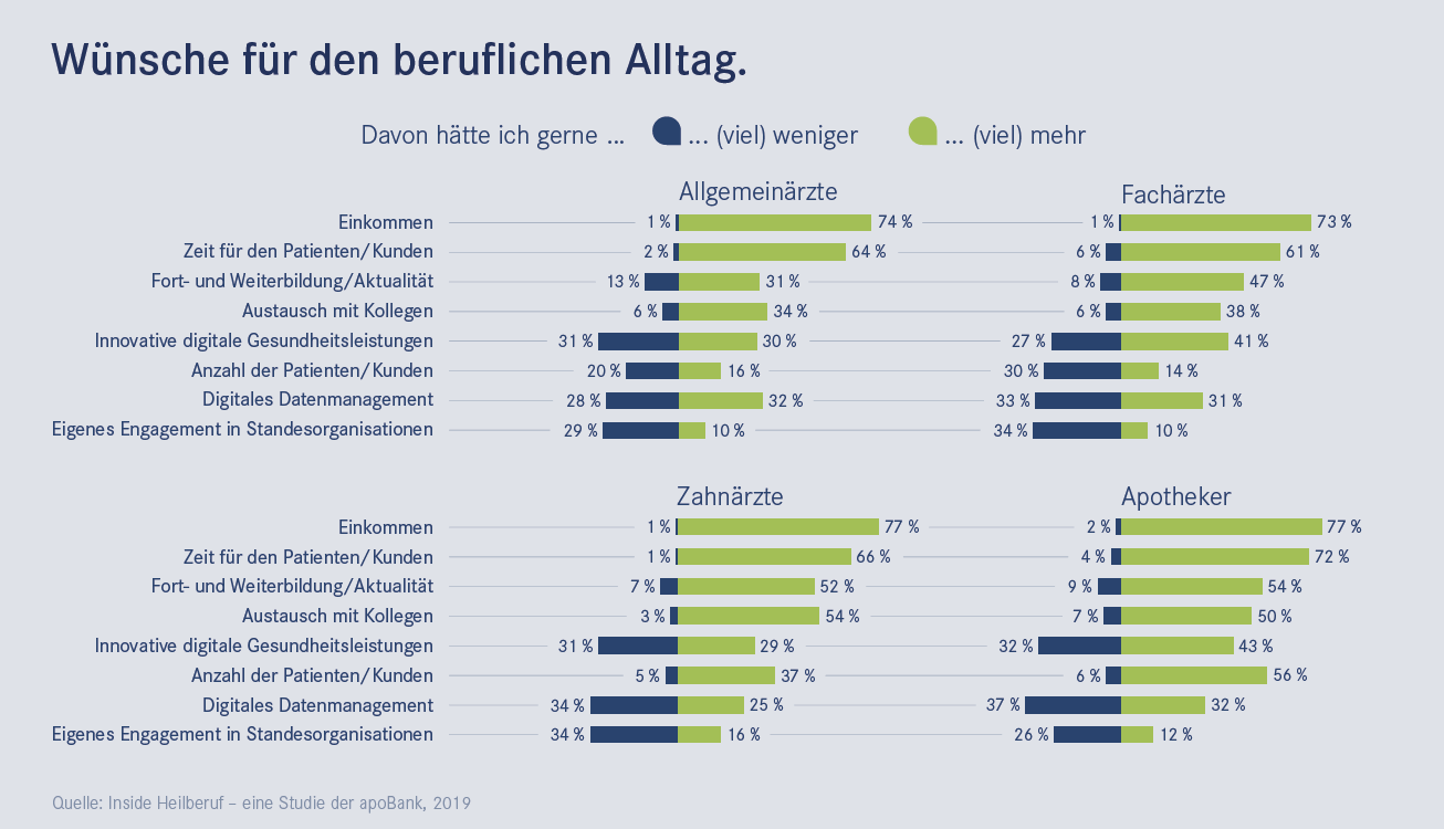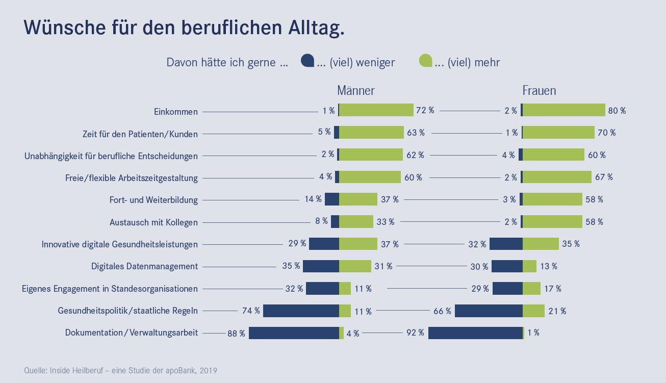 Nach den Wünschen für den beruflichen Alltag gefragt, fällt auf, dass beim Thema Einkommen trotzdem 80 Prozent Frauen einen Aufholbedarf sehen – bei ihren männlichen Kollegen sind es 72 Prozent. Mehr Zeit für die Patienten, flexiblere Arbeitszeitgestaltung und mehr Unabhängigkeit bei beruflichen Entscheidungen stehen bei beiden Geschlechtern oben auf der Wunschliste.