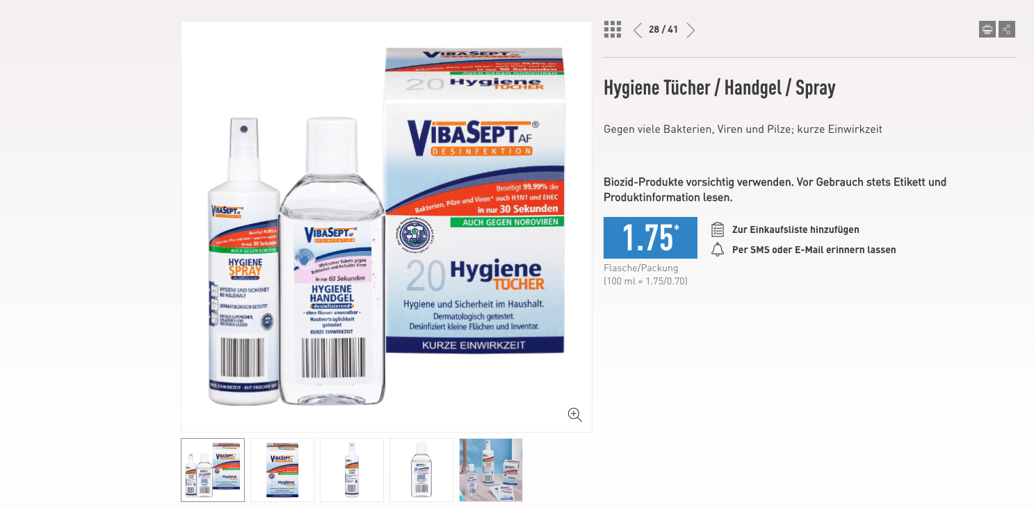 Aldi Nord bietet zwei verschiedenen Produkte an: Die Eigemarke Ombia Med Handgel und Desinfektionsspray jeweils in der 250 ml Flasche für 1,65 Euro. Für 10 Cent mehr gibt es von VibaSept ebenfalls Desinfektionsspray und -gel sowie 20 Hygienetücher. Aldi Süd bietet zum selben Preis nur die VibaSept Produkte an. Welche Mengen Aldi bundesweit in seine Filialen zum Abverkauf liefert, verrät Aldi nicht. „Aktionsartikel werden generell nur begrenzt angeboten“, so ein Firmensprecher. Auch über die Gesamtmenge gibt Aldi keine Auskunft.