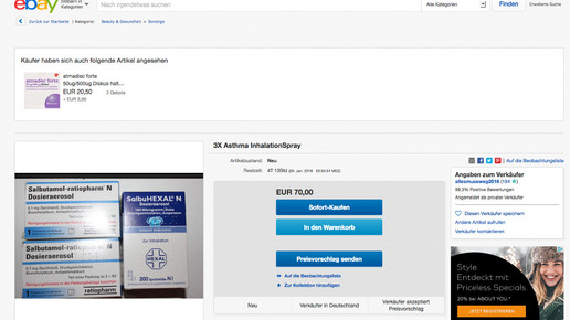 Allesmussweg2016 bietet drei Packungen Salbutamol Spray zum Sofortkauf an. Der Preis für zwei Packungen Salbutamol Ratiopharm und einmal Salbuhexal beträgt 70 Euro. Wird das Angebot nicht vorab gelöscht, kann noch bis zum 29. Januar mitgeboten werden. Die verschreibungspflichtigen Arzneimittel sind ungeöffnet und bis Oktober 2019 beziehungsweise Januar 2020 haltbar. Allesmussweg2016 ist als privater Verkäufer registriert – eine Rücknahme ausgeschlossen. Das Ebay-Mitglied wünscht: „Viel Spaß beim Bieten!“.