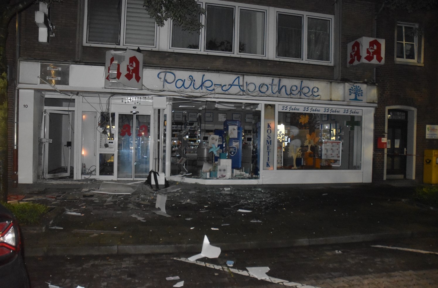 In der Nacht zum 13. September kam es gegen 3.10 Uhr an der Park-Apotheke in Herzogenrath-Merkstein zu einer Explosion. Laut Polizeibericht wurden Anwohner durch einen lauten Knall aufmerksam. An der Apotheke wurden durch die Sprengung Schaufenster sowie die Fassade erheblich beschädigt.