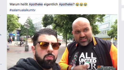 Knapp 64.000 Menschen folgen den Freunden von „Salamu Alaikum TV“ bei Facebook. Die fünf Männer veröffentlichen Beiträge mit einer Mischung aus arabischem und deutschem Humor. In einem Video erklären sie ihren Fans, warum Apotheke eigentlich Apotheke heißt – und ernten 500 Kommentare.