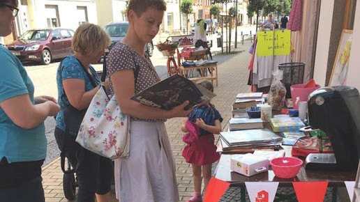 Die Händler in der Kleinstadt Seehauen in Sachsen-Anhalt haben mit einem Flohmarkt für den Erhalt des Vor-Ort-Geschäfts geworben. Auch das Team der Winckelmann-Apotheke beteiligt sich. „Wir wollen die Leute zurückholen“, sagt Filialleiterin Katharina Klaus.
