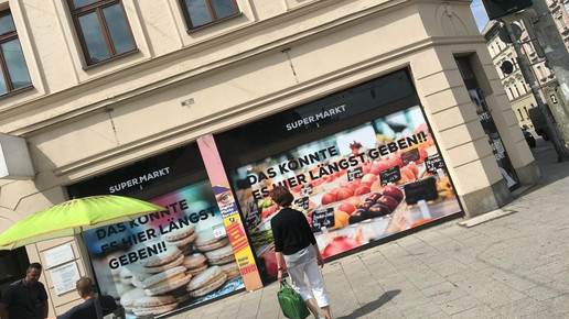 Und Hölzer ist offensichtlich nicht die Einzige, die das Verhalten der Kirche auf die Palme bringt. Nachdem sie ihr Plakat ins Schaufenster gepackt hatte, fühlten sich Unbekannte zu noch größerem Protest veranlasst: Über Nacht beklebten sie die Schaufenster des ehemaligen Fotofachgeschäfts mit professionell erstellten Fensterplakaten. „Supermarkt“ stand da über Bildern erlesener Nahrungsmittel. Auf einem Fenster prangte Käse, auf einem anderen Schinken, auf wieder einem anderen Wein. Über jedem Bild stand der Schriftzug: „Das könnte es hier längst geben!!“ Die Unbekannten kritisierten damit erneut, dass die Kirche dringend benötigte Gewerbe- und Versorgungsfläche, die beispielsweise für einen Supermarkt genutzt werden könnte, sinnlos leer stehen lässt.