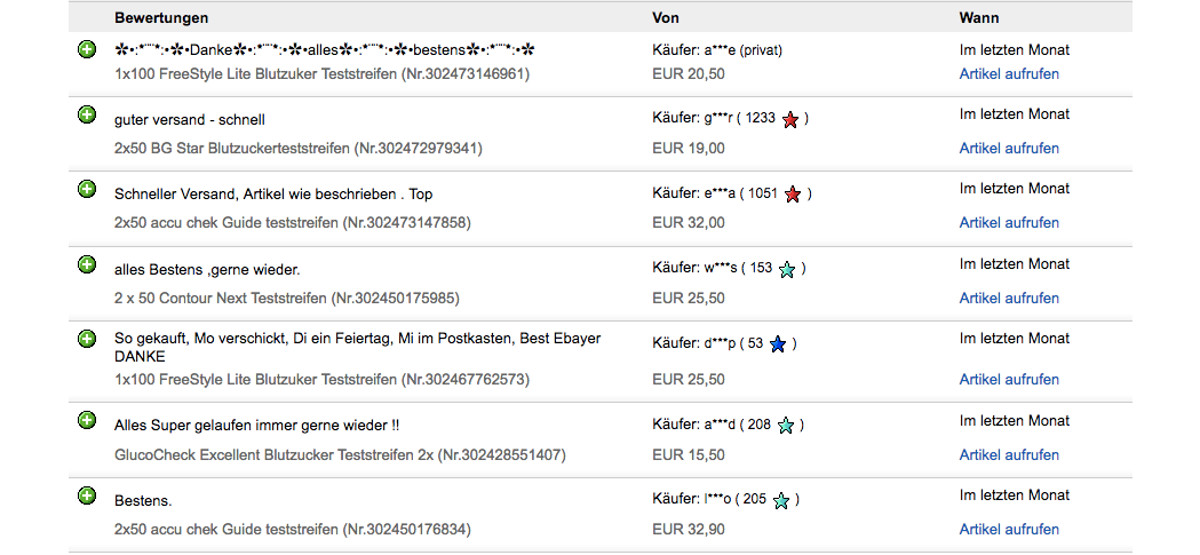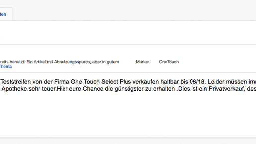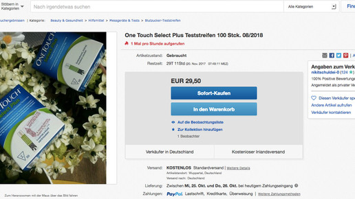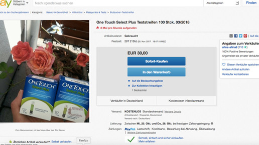 Bei den verkauften Mengen an Teststreifen mit dem gleichen Ablaufdatum stellt sich allerdings die Frage: Wie kommen die Verkäufer an diese Mengen an Teststreifen heran? Verhökern Diabetiker hier im großen Stil ihre auf Rezept erhaltenen Teststreifen oder sind die Offerten auf Fehlbestände in Apotheken oder Großhändler zurückzuführen? Denn die beiden Verkäufer sind bei Weitem nicht die einzigen, die Teststreifen anbieten.