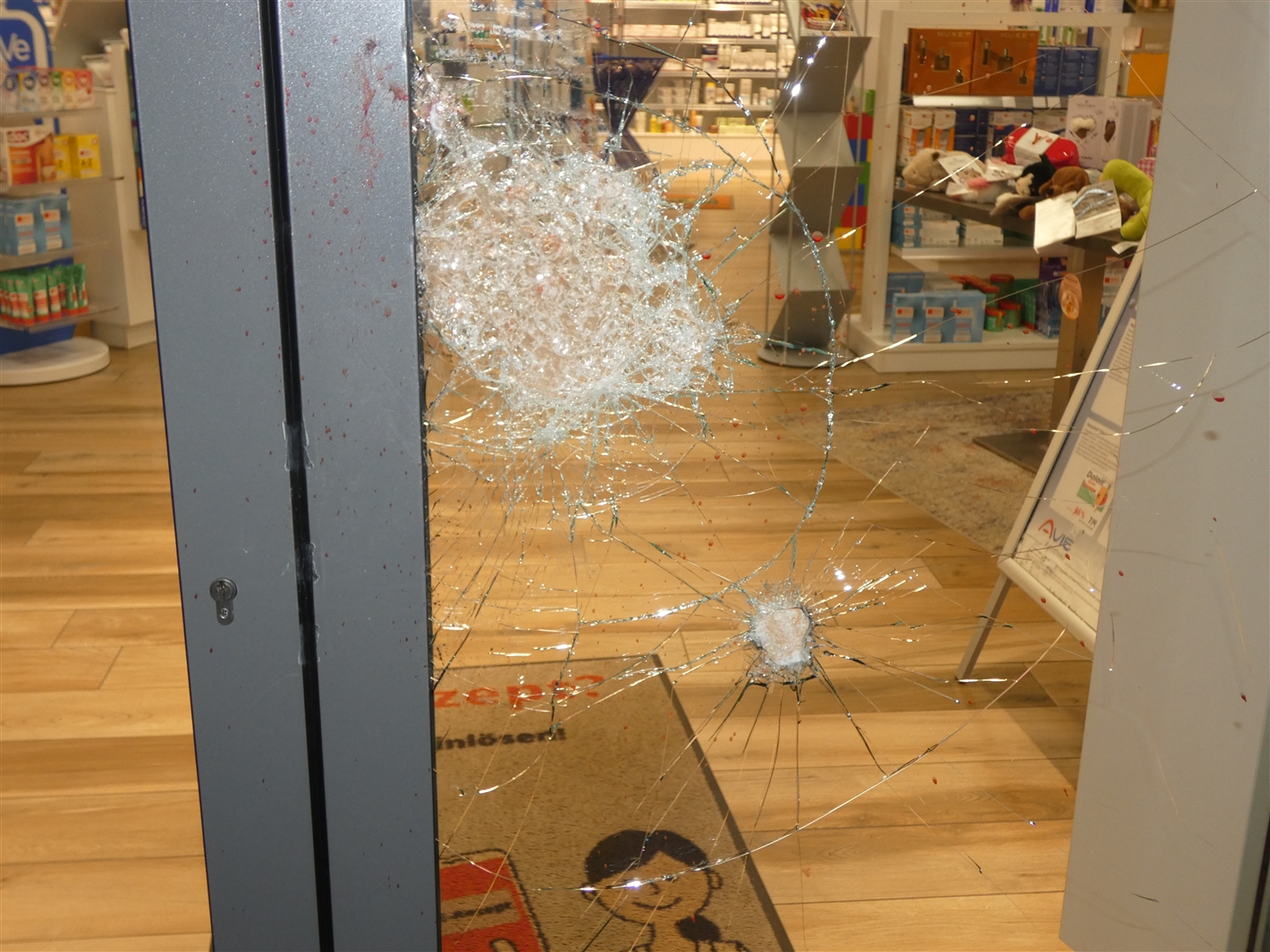 An der Tür der Apotheke erkannten die Polizisten Hebelspuren und Blut. Zudem war die Scheibe gesprungen. In die Offizin konnten sie nicht vordringen. Es entstand ein Sachschaden. Die Kriminalpolizei ermittelt wegen des versuchten besonders schweren Falls des Diebstahls gegen die beiden Männer.