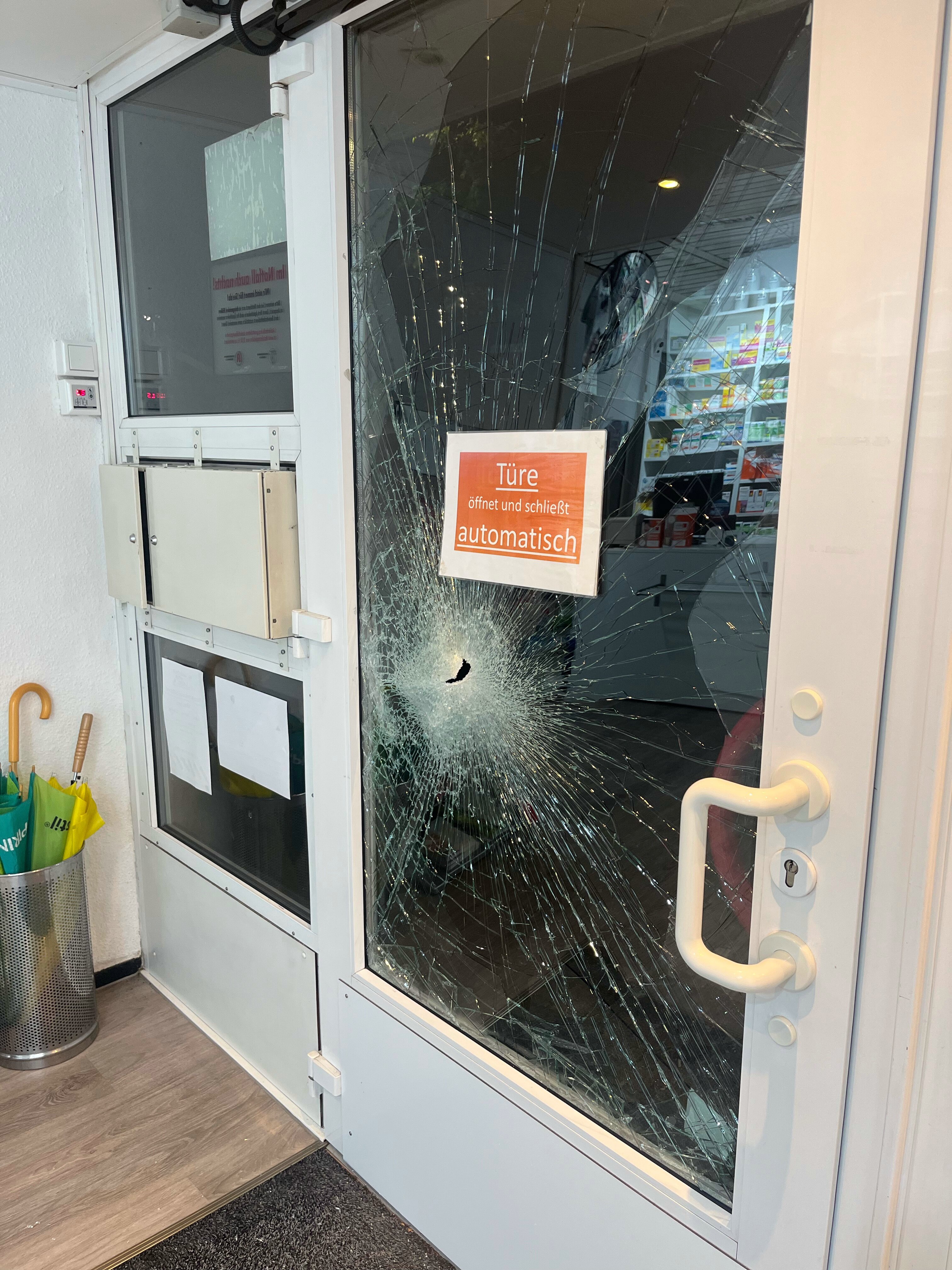 In der Nacht zu Freitag versuchten bislang Unbekannte in eine Apotheke einzubrechen. Bewaffnet mit einem Betonfuß, wollten sie durch die Eingangstür rein. Sie schmissen ihn gegen das Glas, doch die Tür hielt stand.