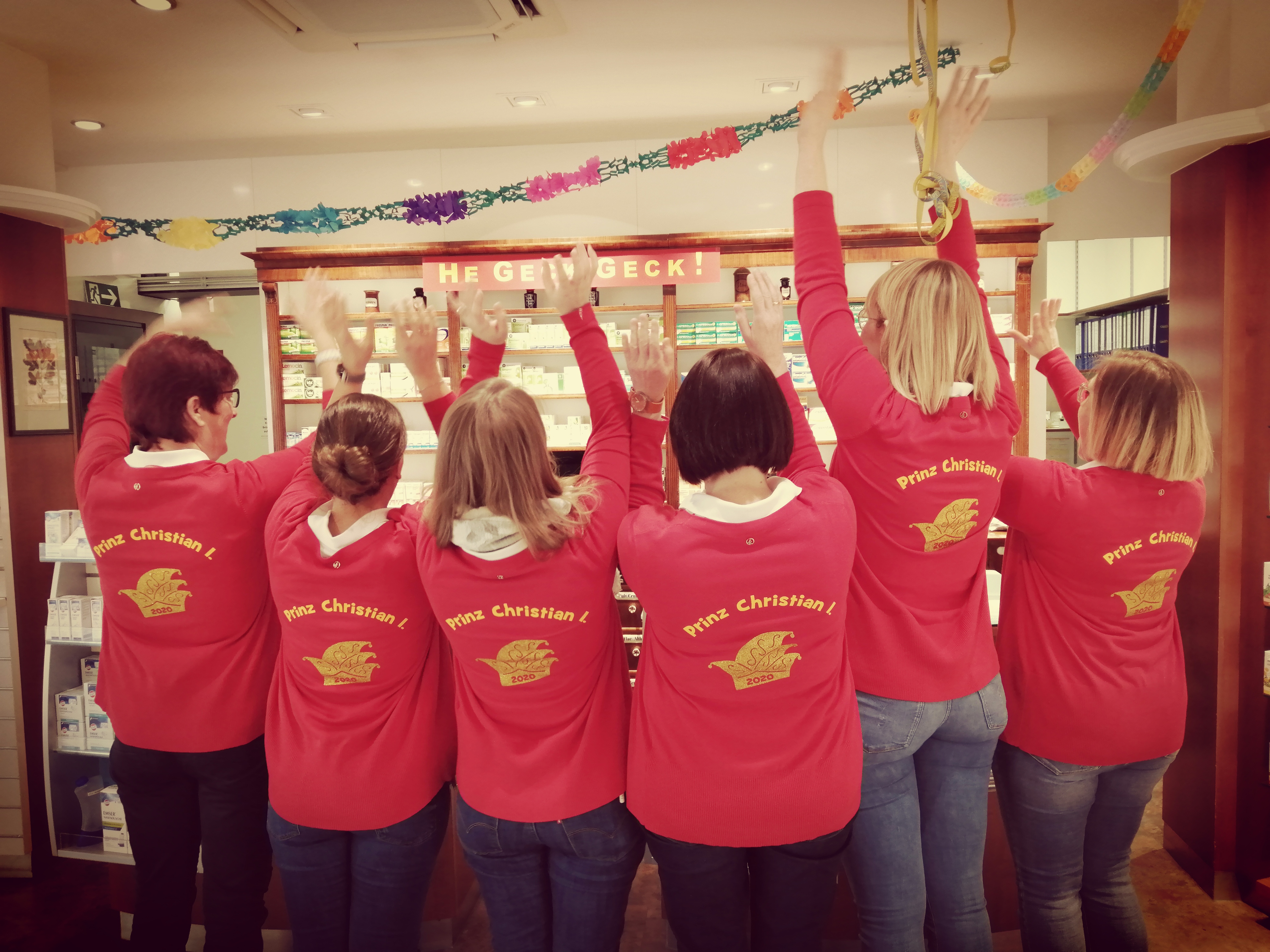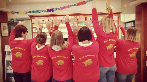 Das durch und durch karnevalistische Team der Kreuz-Apotheke steht voll und ganz hinter ihrem Chef und so ließen sich die Mitarbeiterinnen kurzerhand das Amt des Chefs auf ihrer Arbeitskleidung verewigen: Die extra in den Farben des Vereins gewählten roten Strickjacken ziert nun eine Narrenkappe und die Adelsbezeichnung „Prinz Christian I.“ Zwei langjährige Mitarbeiterinnen erinnern sich gerne an das Jahr 1986 zurück, als bereits Hartmanns Vater, von dem er die Apotheke übernommen hatte, Prinz war: „Wie kann man so ein Glück haben, dass man gleich zwei Prinzenämter in einer Apotheke mitbekommt“, freut sich eine PTA.