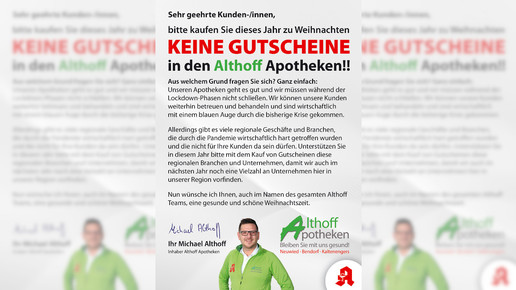 In fetter roter Schrift werden die Kunden seiner Althoff-Apotheken seit der Vorweihnachtswoche beinahe gewarnt: „Bitte kaufen Sie dieses Jahr zu Weihnachten KEINE GUTSCHEINE in den Althoff Apotheken“, heißt es auf den Flyern, die in seinen drei Apotheken in Neuwied, Bendorf und Kaltenegers ausliegen sowie auf den Social Media Accounts seiner drei Betriebe. Darunter erklärt er den Grund für den Aufruf: „Unseren Apotheken geht es gut und wir müssen während der Lockdown-Phasen nicht schließen.“ Stattdessen können sie ihre Kunden weiterhin betreuen und behandeln „und sind wirtschaftlich mit einem blauen Auge durch die bisherige Krise gekommen“, ist da zu lesen. Doch so gehe es nicht allen. Es gebe viele regionale Geschäfte und Branchen, die durch die Pandemie wirtschaftlich hart getroffen wurden und die nicht für ihre Kunden da sein dürfen.