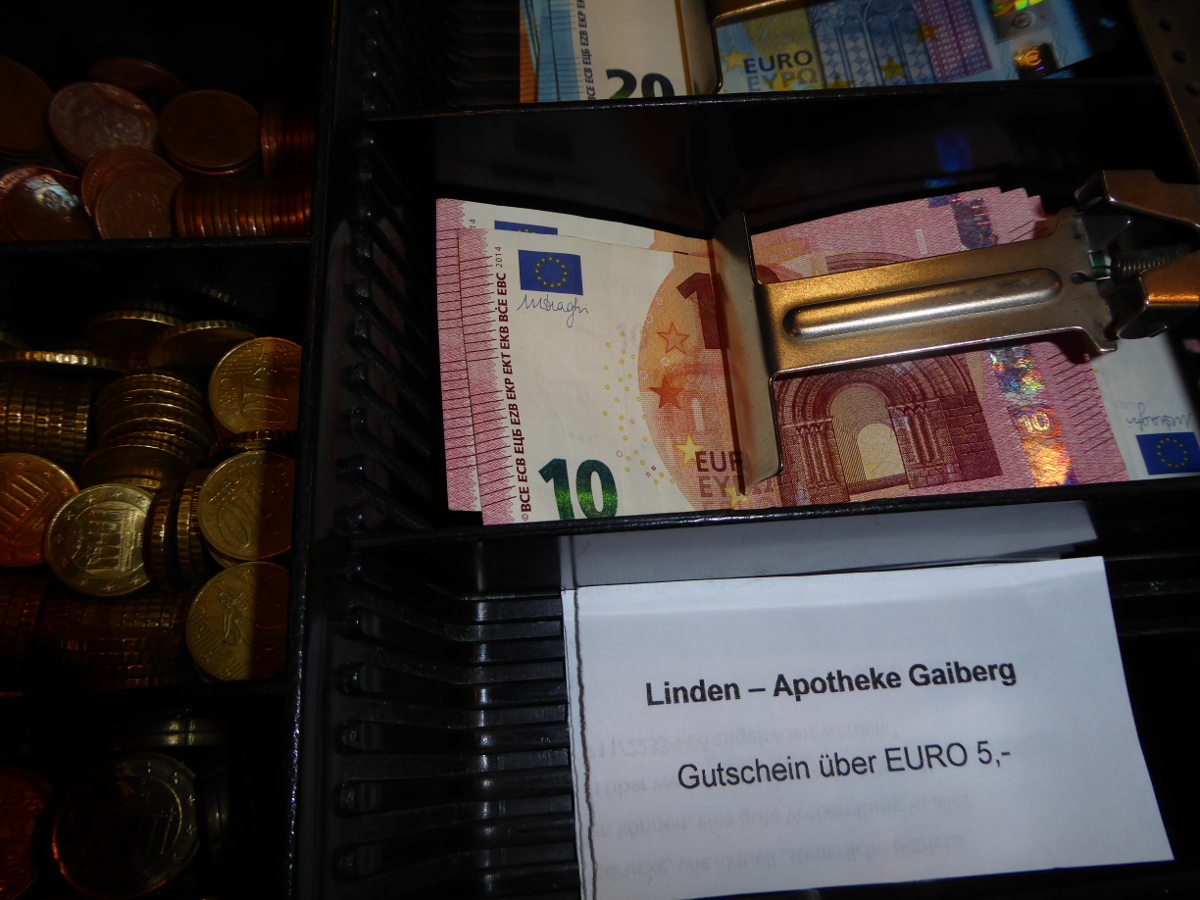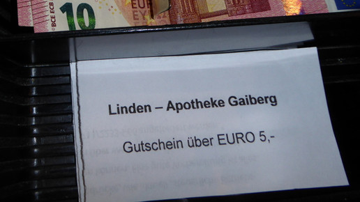 Darum hat Schaetzle jetzt seine eigenen Gutscheine gedruckt. Jedes mal, wenn der Apotheker keinen Fünfer rausgeben kann, erhält der Kunde einen Gutschein, der dann beim nächsten Einkauf verrechnet werden kann. „Da wir auf dem Land sind und Stammkundschaft haben, funktioniert das gut“, erzählt Schaetzle. Die Gaiberger nehmen es mit Humor. Durch Schaetzle und die Berichterstattung in der Regionalpresse wissen sie über den Fünf-Euro-Mangel Bescheid. „Jemand hat mir bereits mehrere Hundert Fünf-Euro-Scheine angeboten“, sagt der Apotheker.