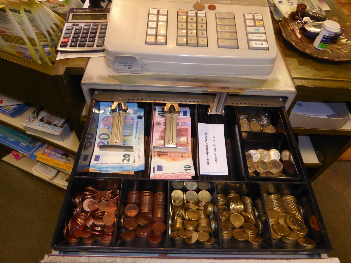 Zunächst half sich der Apotheker damit, Münzen als Wechselgeld zu geben. Allerdings kostet eine Rolle Münzen bei seiner Bank 30 Cent. Zudem sind die Münzen schnell weg, wenn zum Beispiel ein Kunde eine Packung Bonbons für 1,75 Euro kauft und Schaetzle 8,25 Euro als Wechselgeld rausgeben muss.