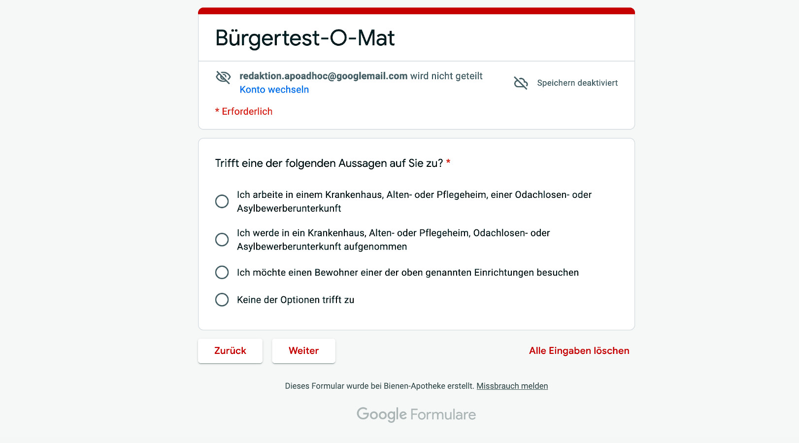 Der „Bürgertest-O-Mat“ wird in fünf Sprachen angeboten und basiert auf einem Google-Formular, man braucht also einen Google-Account. Allerdings wird gleich eingangs versichert, dass in der Standardeinstellung keine Daten gespeichert werden.