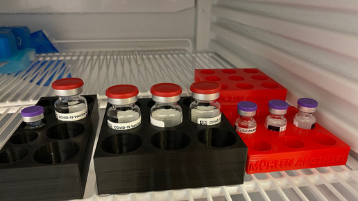Cebulla fiel sofort sein 3D-Drucker ein. Das Gerät schaffte er im Dezember an, um Maskenhalter für den Hinterkopf herzustellen. „Ich entwerfe die 3D-Modelle am Computer und der Drucker erschafft sie.“ Dem Ganzen seien keine Grenzen gesetzt. Benötigt werde eine Datei und flüssiges Plastik. Der Nachteil sei, dass die Herstellung sehr lange dauere, sagt der Apotheker. Für einen kleinen Ständer mit Platz für 6 Vials Biontech würden rund fünf Stunden benötigt, der große Kombi-Ständer mit zusätzlichem Platz für die größeren AstraZeneca-Vials dauere bis zu zehn Stunden.