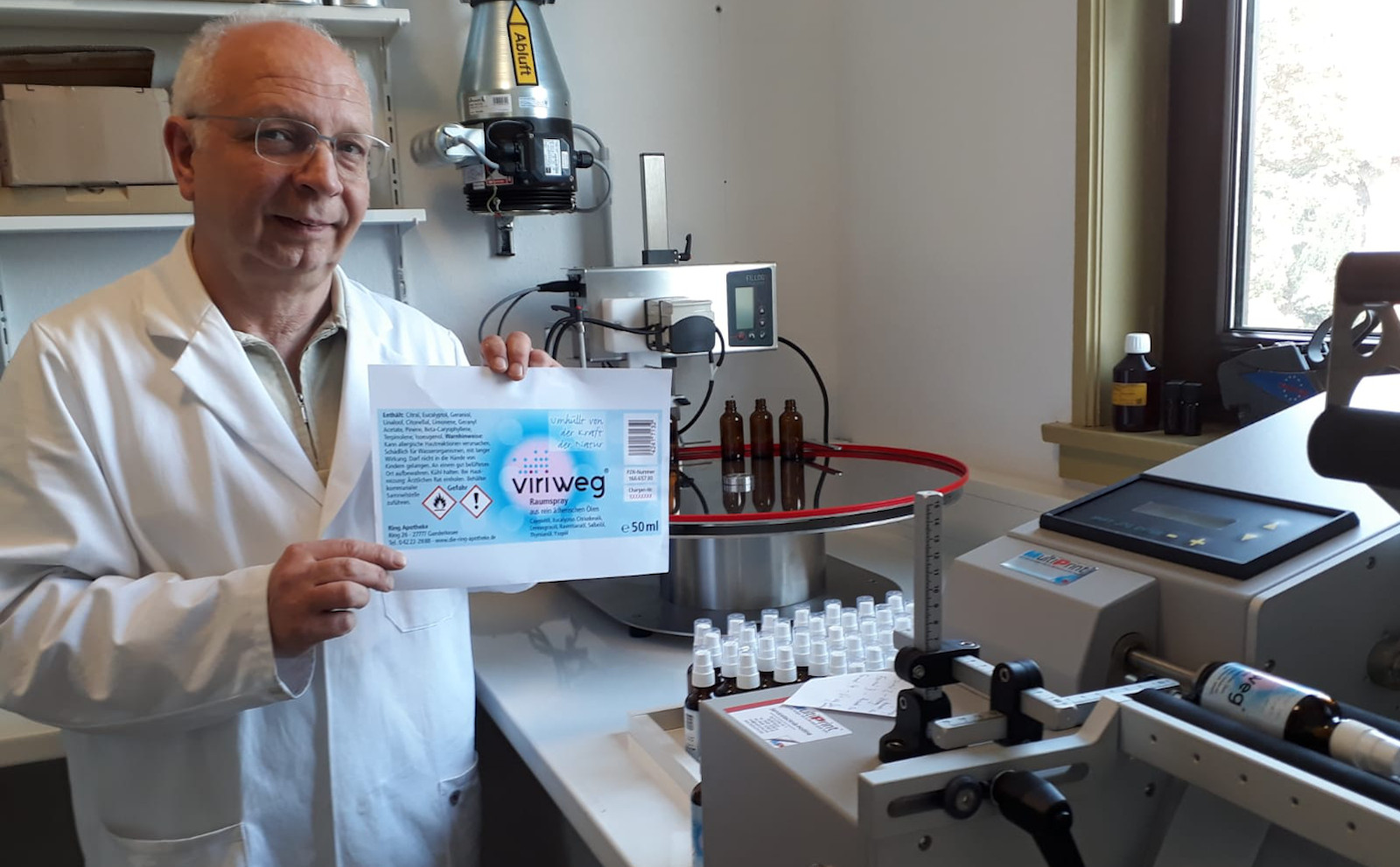 Als die ersten Corona-Fälle in Deutschland auftraten, fragte sich Apotheker Thomas Beck, welchen Beitrag er leisten könnte. Die Idee zu einem möglichst antiviralen Raumspray war schnell geboren. Beck durchforstete seine merh als 250 Bücher zum Thema Aromatherapie und entwickelte eine gut duftende und möglicherweise antiviral wirkende Mischung aus sieben verschiedenen Ölen. In seiner Rezeptur werden die Flaschen à 50 ml abgefüllt. Sein Vorhaben: Der bundesweite Vertrieb von „Viriweg“ über den Großhandel. Die Umsetzung sei in den letzten Zügen.