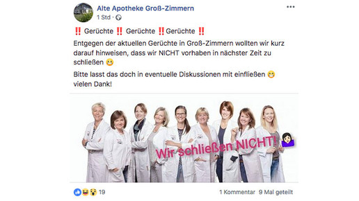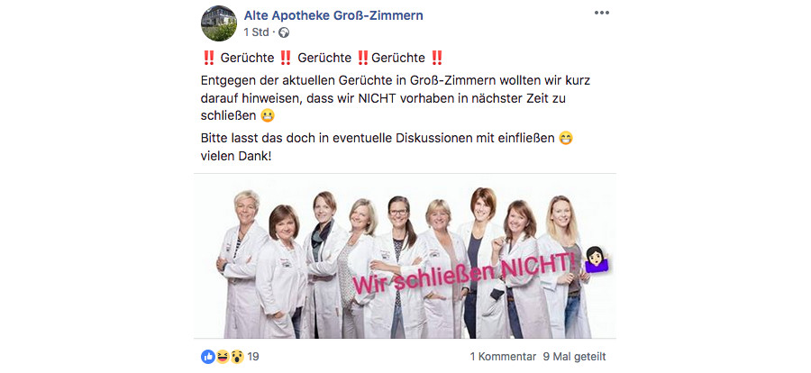 Von Nida wollte jedoch nicht alleine darauf vertrauen, dass die Kundin die frohe Kunde im Ort verbreitet. Die Facebook-affine Unternehmerin veröffentlichte kurzerhand über das soziale Netzwerk eine Botschaft an ihre Fans: „‼️ Gerüchte ‼️ Gerüchte ‼️Gerüchte ‼️ Entgegen der aktuellen Gerüchte in Groß-Zimmern wollten wir kurz darauf hinweisen, dass wir NICHT vorhaben, in nächster Zeit zu schließen. Bitte lasst das doch in eventuelle Diskussionen mit einfließen. Vielen Dank!“