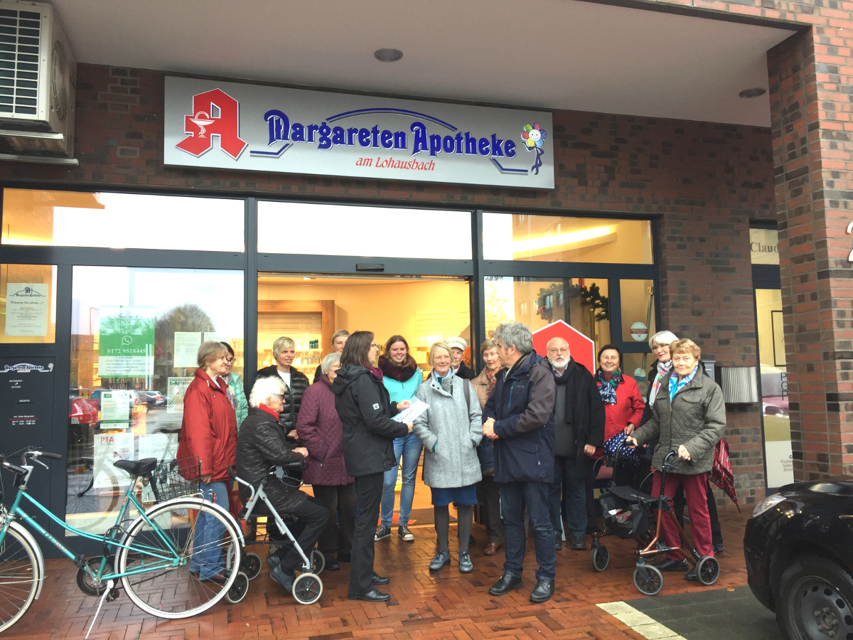 Gemeinsam mit dem Arbeitskreis „Älter werden in Münster-Innenstadt Ost/Mauritz“ nahm die Apothekerin jetzt einen neuen Anlauf. Die Aktiven luden die Politik und die lokalen Medien zu einer Ortsumgehung ein. Dazu sammelten sie innerhalb von wenigen Wochen 560 Unterschriften und übergaben sie in die Obhut des für den Stadtteil zuständigen CDU-Ratsherrn Walter von Göwels. Die Reaktion aus der Stadt klang wie eine Plate mit Sprung: Man prüfe die Angelegenheit. Bergmann bleibt stoisch: „Wir dürfen nicht aufgeben.“