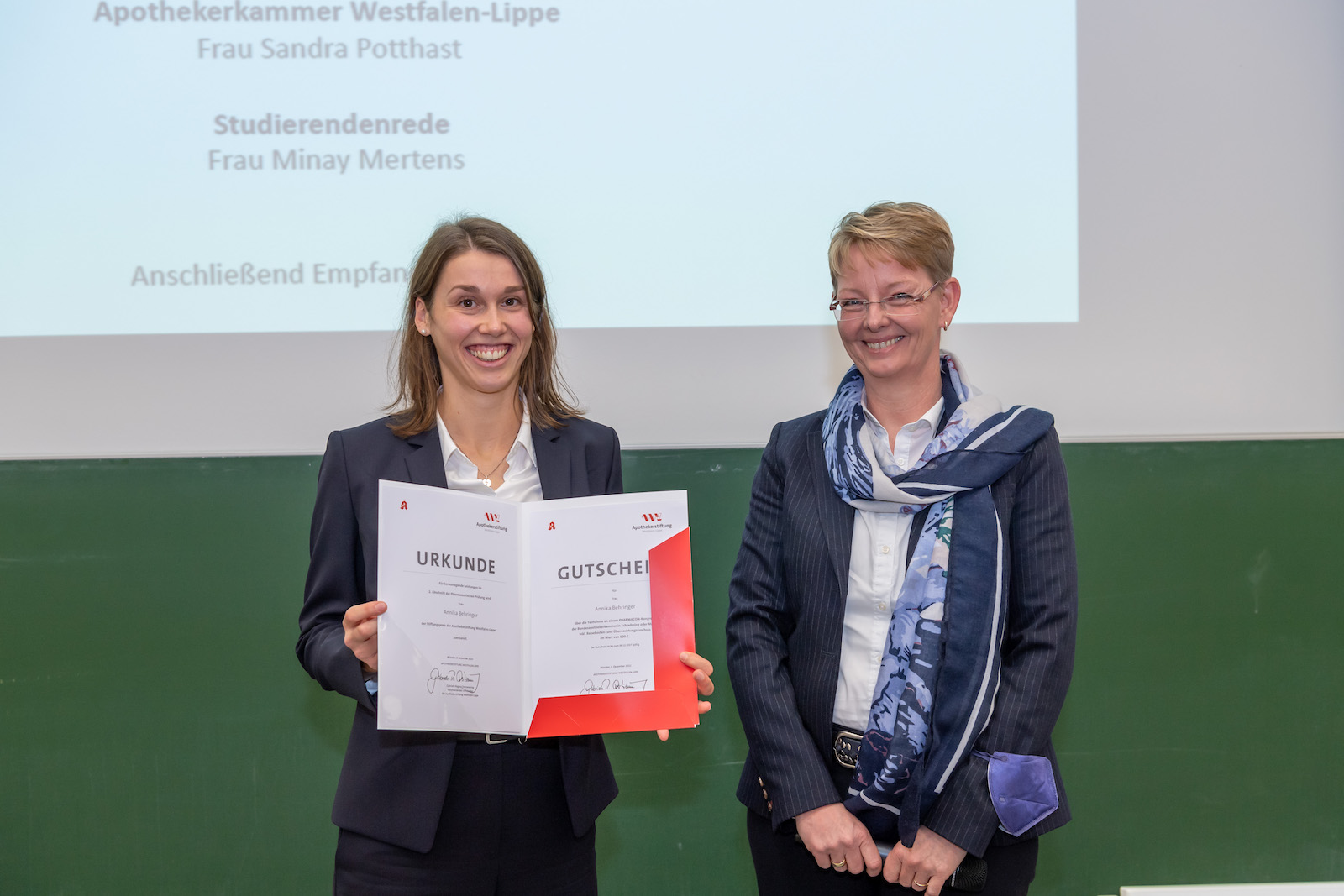 Nun wurde der Stiftungspreis „Traumnote 1,0“ an die Pharmaziestudentin Annika Behringer verliehen. Sie hatte im zweiten Abschnitt der Pharmazeutischen Prüfung alle fünf Studienfächer mit der Note 1,0 abgeschlossen. Ein hochkomplexes Pharmaziestudium zu absolvieren, sei schon eine Leistung für sich, dazu noch alle fünf Fachprüfungen im zweiten Staatsexamen mit der Spitzennote „Sehr gut“ abzuschließen – das sei eine besondere Leistung, so die Stiftung. Sandra Potthast, Vorstandsmitglied der Apothekerkammer Westfalen-Lippe, überreichte Behringer die Urkunde. Dotiert ist der Preis, der regelmäßig an Studierende der Pharmazie in Münster vergeben wird, außerdem mit einem Teilnahmegutschein für einen PHARMACON-Kongress der Bundesapothekerkammer sowie einem Reisekosten- und Übernachtungszuschuss im Wert von 500 Euro. Zuletzt war er im Mai gleich doppelt verliehen worden.