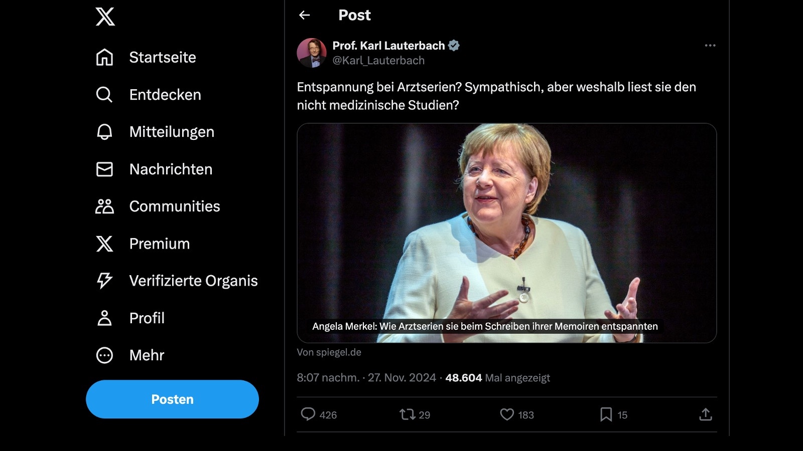 Beim Schreiben ihrer Memoiren hat Angela Merkel wohl gern ferngesehen. „Das hat mich dann einfach mal abgelenkt“, erklärte die Ex-Kanzlerin im Interview mit dem Spiegel. Vorzugsweise soll sie Arztserien geschaut haben, wie der Spiegel titelte. Ein kleines privates Detail über die Ex-Kanzlerin, das nun wirklich rein gar nichts mit ihrer politischen Arbeit zu tun hat. Doch der amtierende Bundesgesundheitsminister Karl Lauterbach (SPD) hielt es – wohl weil in Arztserien schließlich auch die Berufsbezeichnung „Arzt“ steckt – für notwendig, den kurzen Artikel auf der Social-Media-Plattform X zu kommentieren.