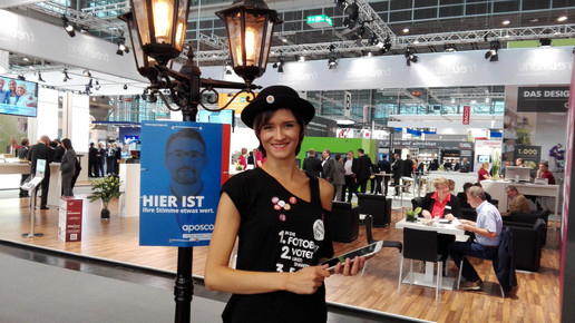 Kollegin Meike ist aus der Hauptstadt angereist, sie ist die gute Seele des Messestandes. Sie weiß, wie das mit der Fotobox geht und berät bei der Auswahl der ulkigen Papp-Brillen. Die sind ganz wichtig, damit die Fotos fröhlich werden. Wir haben auf dem Messestand auch einen fast echten Baum, Bierbänke für die Fachgespräche und einen original Berliner Fußboden.